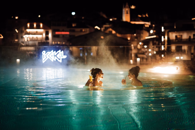 Wer vom Paznaun spricht, der denkt in erster Linie an Ischgl. Und viele die von Ischgl sprechen, denken nicht in erster Linie ans Skifahren. Beide Ansätze sind nicht immer passend. Zwar sind die großen Konzerte längst zurückgekehrt – zum Opening wird Demi Lovato Hollywood-Flair in die Bergwelt bringen, aber Party rückt ein wenig in den Hintergrund – und Party-Guide sind wir keiner. Doch ehe wir uns endgültig den Pisten widmen, noch ein kurzer Abstecher auf die andere Talseite, wo in den vergangenen Jahren von den Berggbahnen mal in die Tiefe gebaut wurde. Entstanden ist um 75 Mio. Euro – wie man beschwört energiesparend mit Wärmerückgewinnungsanlagen – über je vier Stockwerke, in zwei Gebäuden eine Wasserfläche von über 1.000 m2, eine Wasserwelt mit Kinderbecken, Solebecken, Sportbecken, Erlebnisbecken, Whirl-Grotte und Außenbecken und jeder Menge Wärmestuben. Als Kontrastprogramm führt eine 1.300 m2 große Eislaufbahn um die Anlage herum.